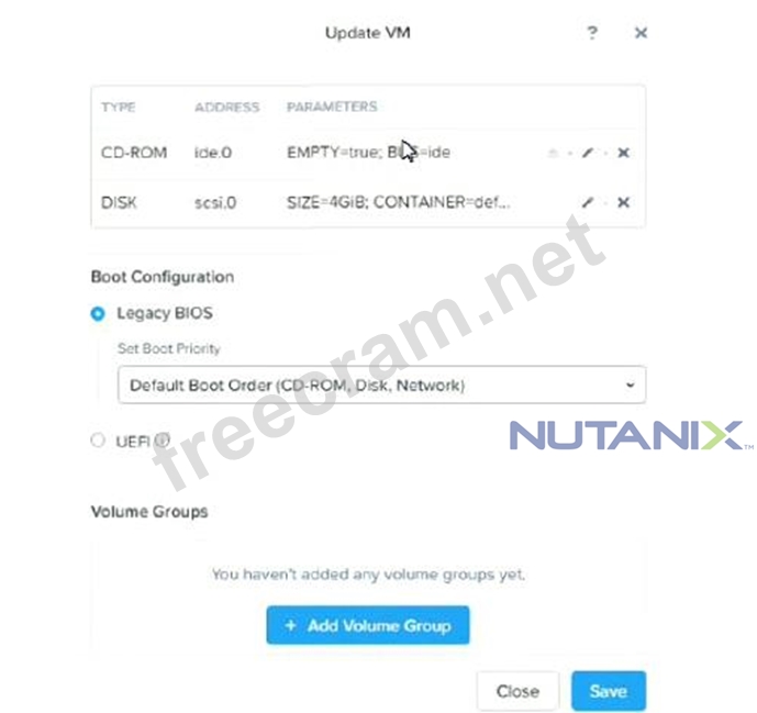 Refer to the exhibit. A team member has built a CentOS VM image for use as a template. An administrator deploys a new VM using the CentOS image as the 05 drive. No other drives are presented to the VM. Following the deployment, the administrator attempts to boot the VM, but is unsuccessful. What could be causing this issue?