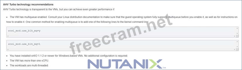 An administrator has an existing cluster and needs to improve performance using AHV Turbo. Which two items are required to achieve even greater performance? (Choose two.)