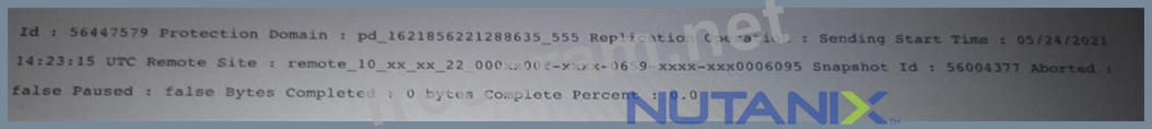 The exhibit indicates a replication operation with specific details about the protection domain, remote site, and snapshot. Key points to note are: Bytes Completed: 0 bytes completed. Complete Percent: 0.0% Paused: false Aborted: false Given these details: No ongoing replication: The operation has started, but there is no progress in terms of bytes completed or percentage completed. Since the status shows 0 bytes and 0 percent completed, it indicates that no data has been replicated yet. Reference: Nutanix Protection Domain and Replication Documentation Nutanix Best Practices for Monitoring Replication