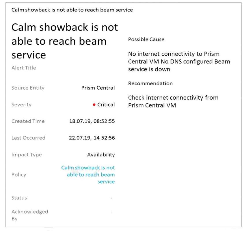 A customer has decided to enable Calm Showback feature but started to receive an alert in Prism Central stating that Calm showback is not able to reach beam service.