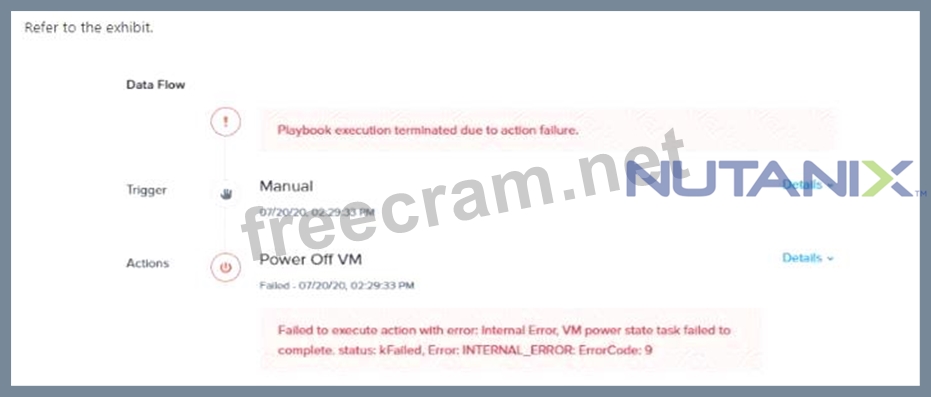 The error message "INTERNAL_ERROR: ErrorCode: 9" typically indicates an issue with the SSH service on the VMs. In this context, where a playbook is being executed to shut down Linux VMs, it's essential that the SSH service is running to allow for remote management and execution of commands. If the SSH service isn't running, the playbook won't be able to execute commands on the VMs, leading to an internal error. References: * Nutanix Multicloud Automation Administration (NMCAA) Course, Module 3: X-Play, Lesson 3.3: Creating and Managing Playbooks, Slide 19: Action Settings * Nutanix Certified Professional - Multicloud Automation (NCP-MCA) Exam Blueprint Guide, Section 3: Validate Blueprints, Playbooks, and Automation Settings, Objective 3.3: Determine the correct method to validate required Playbook configurations