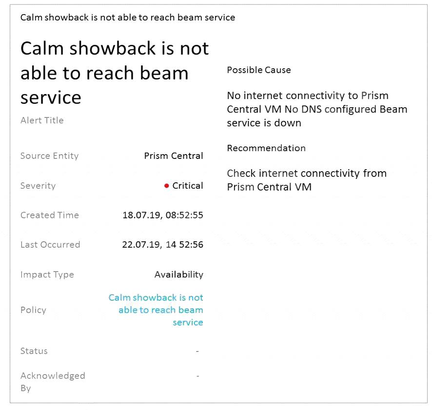The alert in Prism Central indicates that Calm showback is not able to reach the beam service. This could be due to network connectivity issues or incorrect configurations. The administrator should check the DNS configuration in Prism Central (Option A) to ensure that it is correctly configured to allow communication with the Beam service. Additionally, checking if Prism Element is configured with Proxy settings (Option C) is essential as it can also affect the communication between Calm and Beam. Pulse (Option B) and Flow (Option D) are not related to the Calm showback feature and do not impact its functionality. References: * Nutanix Certified Professional - Multicloud Automation (NCP-MCA) v6.5, Section 2 - Deploy and Configure Nutanix Calm and Related Components, Objective 2.4 - Identify required configuration settings for a Nutanix Calm deployment * Enabling and Disabling Showback in Calm | Nutanix Community