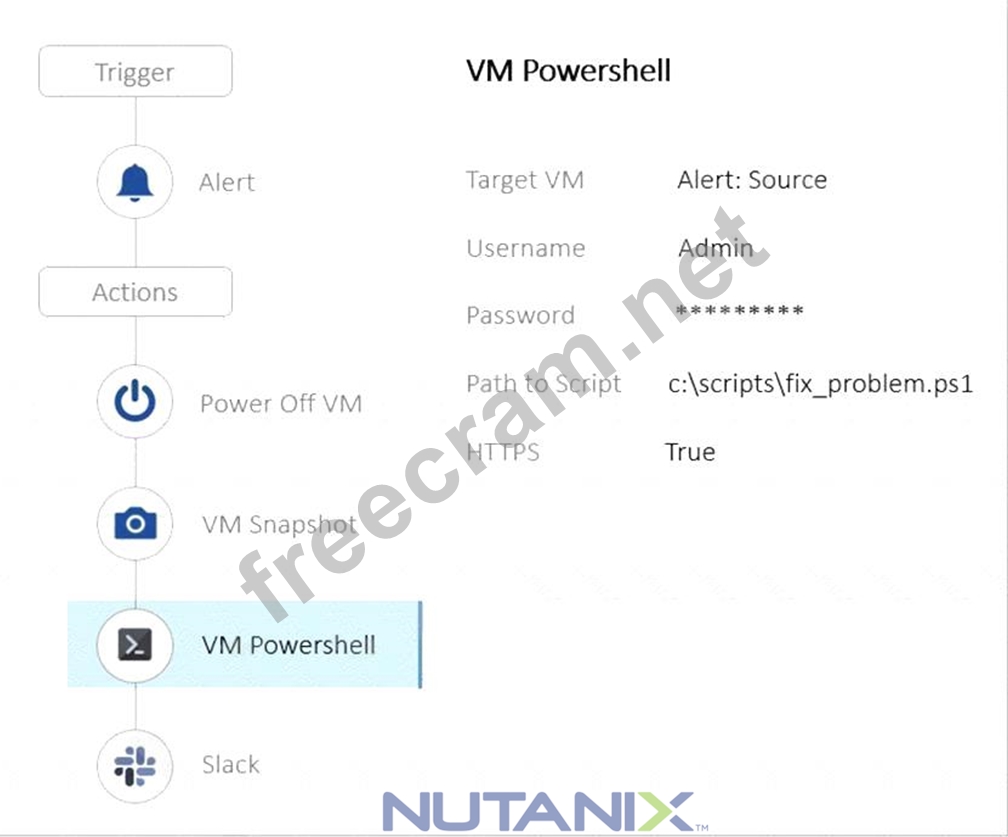 In the context of Nutanix Multicloud Automation (NCP-MCA), the order of actions in a playbook is crucial for its successful execution. In this case, the playbook is designed to execute a script to fix a known problem in an application but keeps failing because it attempts to power off the VM and take a snapshot before executing the script. The correct order should be to execute the script first, then power off the VM if necessary, and finally take a snapshot. References: I found some references from Nutanix Multicloud Automation (NCP-MCA) Learning documents or resources that might be helpful for you: * Nutanix Certified Professional - Multicloud Automation (NCP-MCA) 6.5 Exam: This is the official exam blueprint guide that covers the objectives, topics, and skills required for the certification. It also provides some sample questions and answers. * Nutanix Certified Professional - Multicloud Automation (NCP-MCA) Exam Blueprint Guide: This is another version of the exam blueprint guide that has similar content as the previous one. * Free Questions for NCP-MCA by certscare - p2pexams.com: This is a PDF document that contains 11 questions and answers for the NCP-MCA exam. The question you asked is one of them, and the answer is the same as mine.