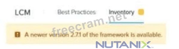 When Life Cycle Manager (LCM) reports thata newer framework version is available, thecorrect actionis toperform an inventory scan (Option C). * Performing an inventory scan updates the available firmware/software versionsand allows LCM to download required updates. * Option A (Run an AOS upgrade)is unrelated to the LCM framework update process. * Option B (Run an AHV upgrade)is a separate component update and does not affect the LCM framework. * Option D (Download manually from a CVM)is not necessary because LCM updates are automatically pulled after an inventory scan. References: Nutanix LCM User Guide #Updating LCM Framework and Performing Inventory Scans Nutanix KB #Best Practices for LCM Updates Nutanix Prism Central #LCM Update Workflow