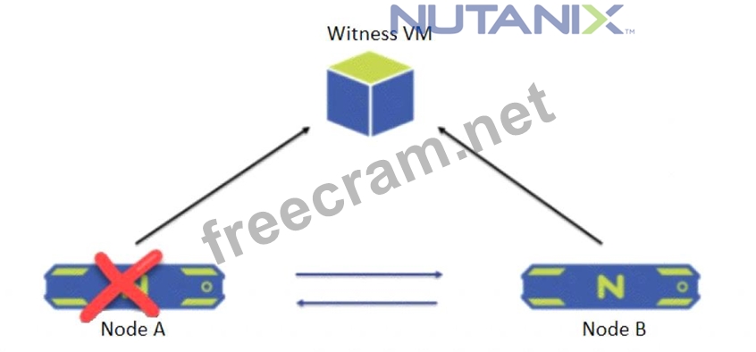 A two-node ROBO cluster is configured with a witness VM. What happens when Node A goes down?