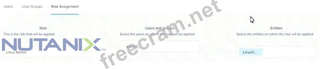 According to the Nutanix Prism Central Guide, role-based access control (RBAC) in Prism Central allows you to create custom roles and assign them to users or groups based on the categories of the entities they need to manage1. Categories are key-value pairs that you can assign to entities such as VMs, hosts, clusters, images, etc. to group them logically2. For example, you can create a category key called "OS" and assign values such as "Linux" or "Windows" to different VMs based on their operating system. In the exhibit, the Linux Admin role has been created with the following settings: * The role has the "VM Admin" permission, which allows the user to perform all actions on VMs3. * The role has been assigned to the admin1 user. * The role has been scoped to the entities that have the category key "OS" and the value "Linux". However, the admin1 user does not have access to all Linux VMs in the environment. This means that some of the Linux VMs do not have the proper category assigned to them. To grant the proper access, the administrator should add the category key "OS" and the value "Linux" to each Linux VM that needs to be managed by the Linux Admin role. This can be done either individually or in bulk through Prism Central4. Once the categories are added, the admin1 user will be able to see and manage all Linux VMs in the environment.