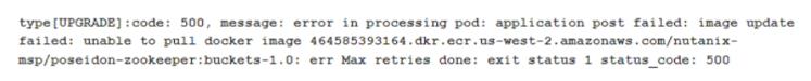 An administrator is upgrading Objects when the following error message is shown: type [UPGRADE] : code: 500, message: error in processing pod: application post failed: image update failed: unable to pull docker image 464585393164. dkr. com/nutanix- msp/poseidon-zookeeper:buckets-l.o: err Max retries done: exit status 1 status code: 500 How should the administrator resolve this error?