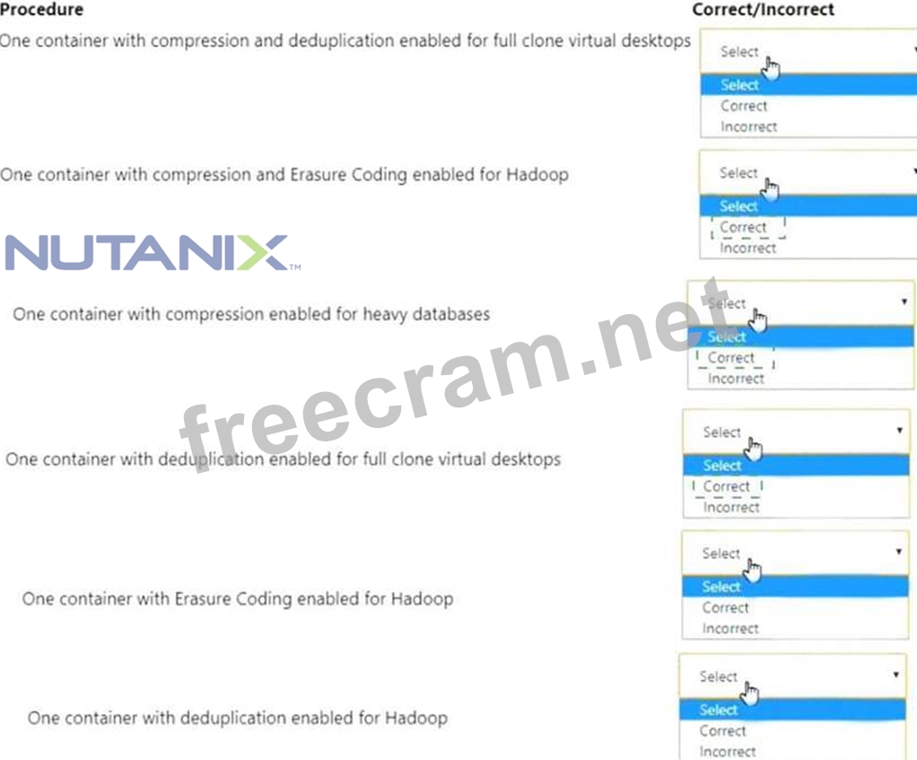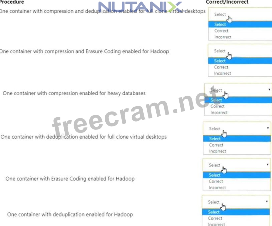 Whichthree correct configuration options should the administrator use to meet the item requirements? (Choose three.) For each procedure, indicate whether it is a correct or incorrect procedure that must be configured to meet the item requirements using the drop-down option.