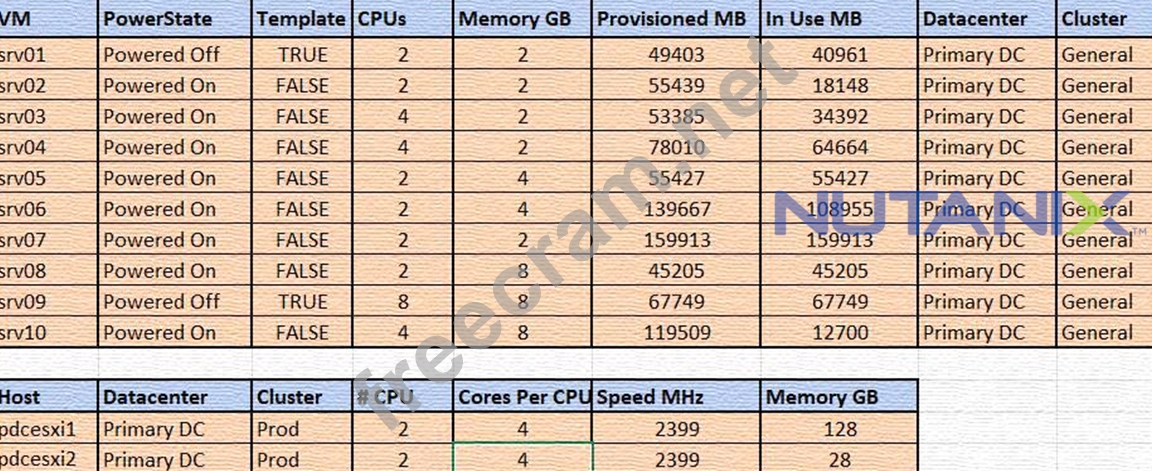C: 48GB: * Based on the provided exhibit, the SE should enter the total amount of RAM required for the entire workload into the Sizer tool. The exhibit shows multiple VMs with different memory allocations. * Summing up the memory allocations: 8GB (VM1) + 8GB (VM2) + 8GB (VM3) + 8GB (VM4) + 8GB (VM5) + 8GB (VM6) = 48GB * Therefore, the SE should input 48GB as the total RAM required for the workload. References: * Nutanix Sizer tool documentation and guidelines for entering raw input workloads and calculating total memory requirements.