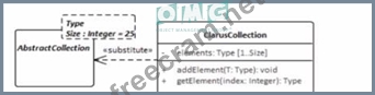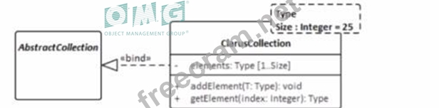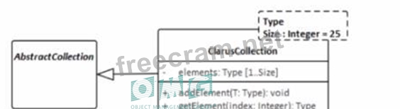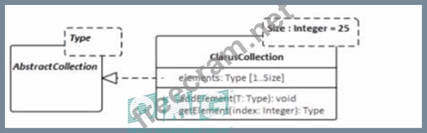 The UML model fragment that best supports the project's requirements for collection class design is one that allows the fixed length of the collections to be specified but also permits flexibility for collections longer than 25 elements. In Option C, theClarusCollectionclass is shown as a template class with a template parameter Sizeset to a default of 25. However, the dashed lines and the separate box forTypeandSizeindicate that while there is a default value, it can be overridden. This means that theSizecan be parameterized, thus allowing the creation ofClarusCollectioninstances with different fixed lengths, not just 25. This design will enable most collections to be created with the default size of 25, but also allows for creating collections with sizes greater than 25, providing the flexibility required by the project's requirements. This adheres to the UML 2.x specification on templates and parameterization.