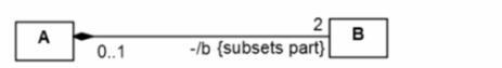 In UML, the{subsets}keyword is used to indicate that one property is a subset of another property. In the provided diagram fragment, the association end-b {subsets part}indicates that the propertybon classAis a subset of the propertyparton classB. This means that the elements associated withAthroughbare contained within the larger set associated withBthroughpart. This kind of relationship is typically used in more complex class models where a part-whole hierarchy is represented, and it allows the model to show that certain associations are more specific subsets of a more general association. This usage is explained in the UML 2.x Superstructure Specification, where the semantics of association subsets are defined.
