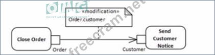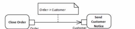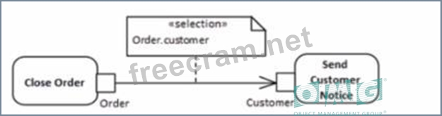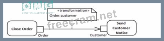 The correct answer is C, which uses a transformation edge to indicate that when an order is closed, information is transformed or processed to notify the customer. This is expressed in UML with an object flow that has a transformation property, which specifies how an object is transformed from one state to another as it flows along the edge. Thisis appropriate for a scenario where closing an order leads to the creation of a customer notice, implying some form of transformation or processing of the order information to generate the notice. References: * UML 2.5 Specification: The UML 2.5 specification details how object flows with transformations can be used to show that one piece of data is transformed into another as it flows from one action to another.