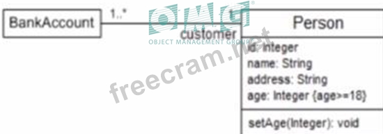 In UML 2, a class diagram is used to depict the structure of a system by showing the system's classes, their attributes, operations (or methods), and the relationships among the classes. The constraint{age >= 18}in the Personclass diagram indicates a condition that must hold true for the instances of thePersonclass whenever they are used in the context of aBankAccount. This constraint is an invariant of thePersonclass that specifies the rule for the attributeage. Now, let's consider the provided options and explain why option B is correct: A: The preferred age to open a bank account is 18 years old or older - This statement is incorrect because the diagram does not indicate a preference; it indicates a constraint or a rule. B: Only customers who are 18 years old or older can open a bank account - This is the correct statement. The {age >= 18}constraint next to theageattribute of thePersonclass signifies that any instance ofPersonassociated with aBankAccountmust be at least 18 years old. SincePersonis connected toBankAccountwith the role namecustomer, this implies that only persons who are at least 18 can be customers of a bank account. C: The age condition should only hold when the setAge(Integer) function is called - This statement is incorrect because the constraint{age >= 18}is not a condition that applies only when thesetAgeoperation is invoked. Instead, it is a class invariant that must always hold true for any instance ofPerson. D: An object of Customer with age set to 18 or greater will raise an exception - This is incorrect because the UML diagram specifies a constraint, not an exception condition. The constraint ensures validity, not the raising of an exception. The answer is verified according to the UML 2 Foundation documents, such as the UML 2.5 specification, where class diagrams and constraints are defined. The specification states that constraints are semantic conditions or restrictions expressed in natural language text or in a machine-readable language that must hold true for the system being modeled (UML 2.5 specification, section 7.9).
