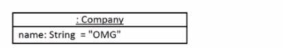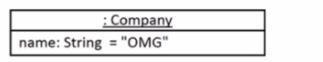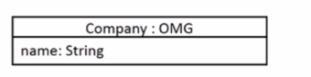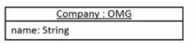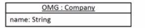To represent an instance of a class in a UML Object Diagram, the standard notation is to specify the instance name followed by a colon and the class name, and then list the attribute values within the compartment. The class definition forCompanyspecifies that there is one attribute,name, of typeString. An instance ofCompanywhere thenameattribute has the value "OMG" would be shown as follows: InstanceName :ClassNameattributeName=attributeValue In the provided options, Option D correctly represents an instance of theCompanyclass with thenameattribute set to "OMG". The name of the instance is not specified, which is allowed in UML when the instance name is not important or is understood from the context. Thus, the correct answer is: D: Option D