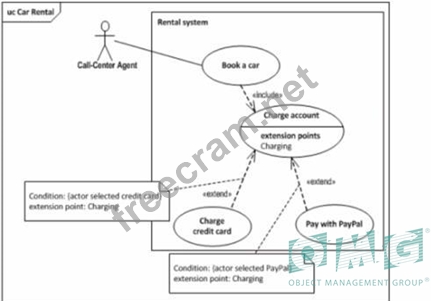 In UML, the «extend» relationship indicates that the behavior defined in the extending use case (the extension) can be inserted into the behavior defined in the extended use case (the base). The extension occurs only under certain conditions, which are specified by the extension points. This relationship allows for the addition of optional behavior to a use case, which can be activated under certain conditions. The diagram provided shows an extension relationship where "Charge credit card" and "Pay with PayPal" are extending "Charge account" use case at the "Charging" extension point. The key benefit of using the «extend» relationship in this context is that it allows for the flexible addition of new behaviors (like new payment methods) without modifying themain use cases. It helps in evolving the system by adding optional behaviors that only occur under certain conditions, which is mentioned as an option: C: This Use Case model could be updated with further payment methods without changing the main Use Cases "Book a car" and "Charge account". This means that new payment methods could be incorporated as additional extending use cases in the future, just like "Charge credit card" and "Pay with PayPal". The other options do not correctly describe the use of the «extend» relationship: A) «extend» relationships do not replace the need for behavior descriptions such as activities. B) It's not about functional decomposition; it's about adding optional or conditional behavior. D) «extend» is not a taxonomic relationship and does not extract general descriptions into a super Use Case; rather, it adds behavior under certain conditions. Therefore, the correct answer is: C: This Use Case model could be updated with further payment methods without changing the main Use Cases "Book a car" and "Charge account".