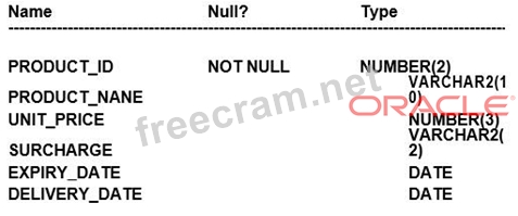 B . SELECT product_id, (unit_price * 0.15 / (4.75 + 552.25)) FROM products; C. SELECT product_id, (expiry_date - delivery_date) * 2 FROM products; E. SELECT product_id, unit_price, unit_price + surcharge FROM products; Comprehensive and Detailed Explanation WITH all Reference: A . This is invalid because "Discount" is a string literal and cannot be used without quotes in an arithmetic operation. Also, there is a typo in unit_pricer, and 'discount' is not a defined column in the table. B. This is valid. It shows a mathematical calculation with unit_price, which is of NUMBER type. Division and multiplication are valid operations on numbers. C. This is valid. The difference between two DATE values results in the number of days between them, and multiplying this value by a number is a valid operation. D. This is invalid because expiry_date is of DATE type and cannot be multiplied by a number. Also, there's a typo: "SPLECT" should be "SELECT". E. This is valid. Both unit_price and surcharge are NUMBER types, and adding them together is a valid operation. F. This is invalid because concatenation operator || is used between a number (unit_price) and a string literal "Discount", which is not enclosed in single quotes, and 'discount' is not a defined column in the table. In SQL, arithmetic operations on numbers and date arithmetic are valid expressions. Concatenation is also a valid expression when used correctly between string values or literals. Operations that involve date types should not include multiplication or division by numbers directly without a proper interval type in Oracle SQL. These rules are detailed in the Oracle Database SQL Language Reference, where expressions, datatype precedence, and operations are defined.