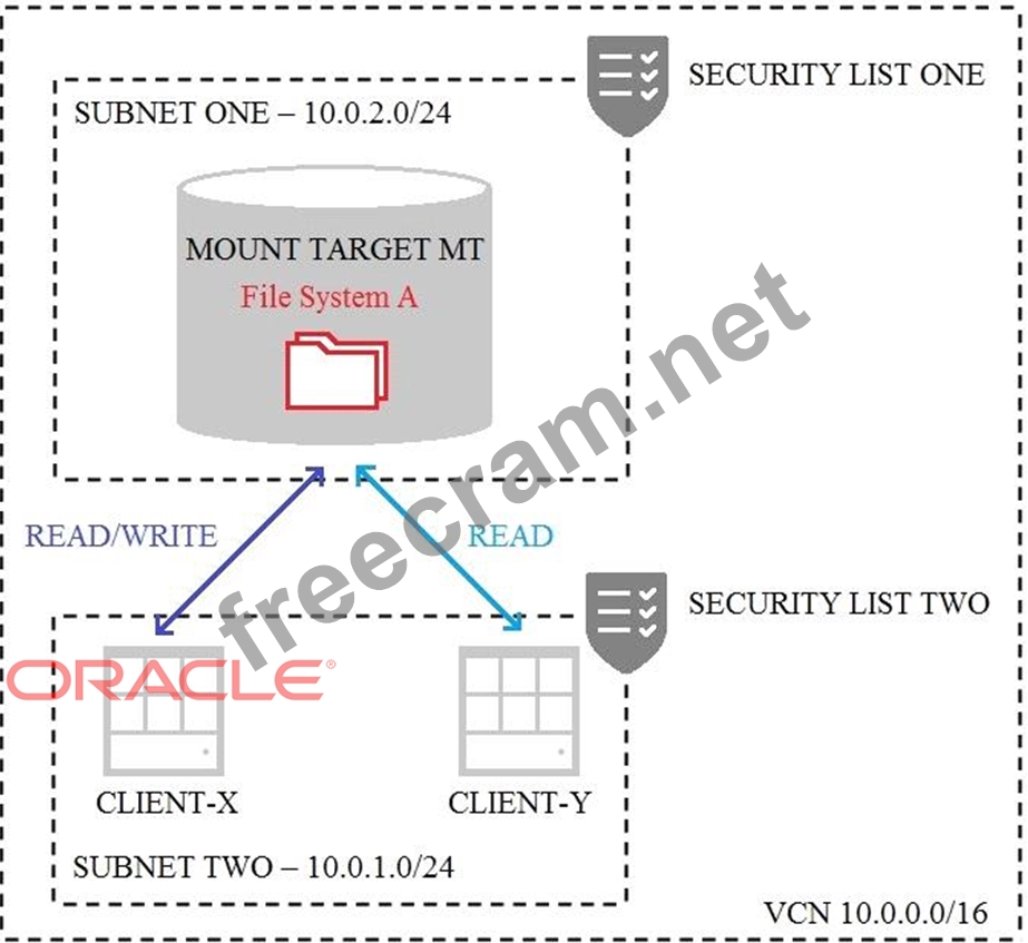 You have setup your environment as shown below with the Mount Target "MT" successfully mounted on both compute instances CLIENT-X and CLIENT-Y.