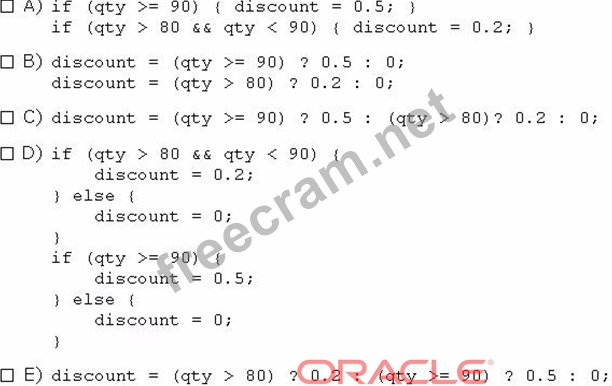 If the value of the qty variable is greater than or equal to 90, discount = 0.5 If the value of the qty variable is between 80 and 90, discount = 0.2 Which two code fragments can be independently placed at line n1 to meet the requirements? (Choose two.)