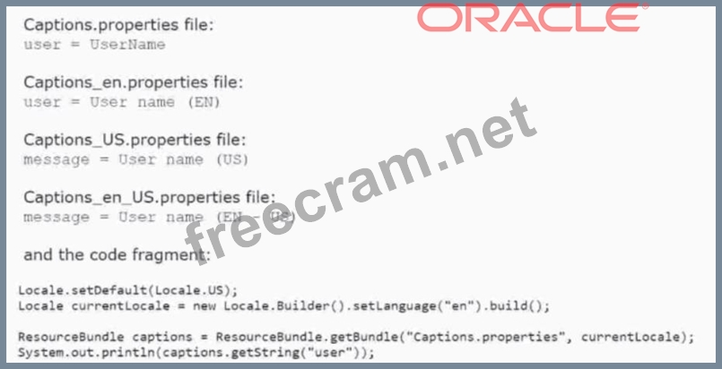 The answer is B because the code fragment contains a logical error that causes a MissingResourceException at runtime. The code fragment tries to load a resource bundle with the base name "Captions.properties" and the locale "en_US". However, there is no such resource bundle available in the classpath. The available resource bundles are: Captions.properties Captions_en.properties Captions_US.properties Captions_en_US.properties The ResourceBundle class follows a fallback mechanism to find the best matching resource bundle for a given locale. It first tries to find the resource bundle with the exact locale, then it tries to find the resource bundle with the same language and script, then it tries to find the resource bundle with the same language, and finally it tries to find the default resource bundle with no locale. If none of these resource bundles are found, it throws a MissingResourceException. In this case, the code fragment is looking for a resource bundle with the base name "Captions.properties" and the locale "en_US". The ResourceBundle class will try to find the following resource bundles in order: Captions.properties_en_US Captions.properties_en Captions.properties However, none of these resource bundles exist in the classpath. Therefore, the ResourceBundle class will throw a MissingResourceException. To fix this error, the code fragment should use the correct base name of the resource bundle family, which is "Captions" without the ".properties" extension. For example: ResourceBundle captions = ResourceBundle.getBundle("Captions", currentLocale); This will load the appropriate resource bundle for the current locale, which is "Captions_en_US.properties" in this case. Reference: Oracle Certified Professional: Java SE 17 Developer Java SE 17 Developer OCP Oracle Certified Professional Java SE 17 Developer Study Guide ResourceBundle (Java Platform SE 8 ) About the ResourceBundle Class (The Java™ Tutorials > Internationalization)