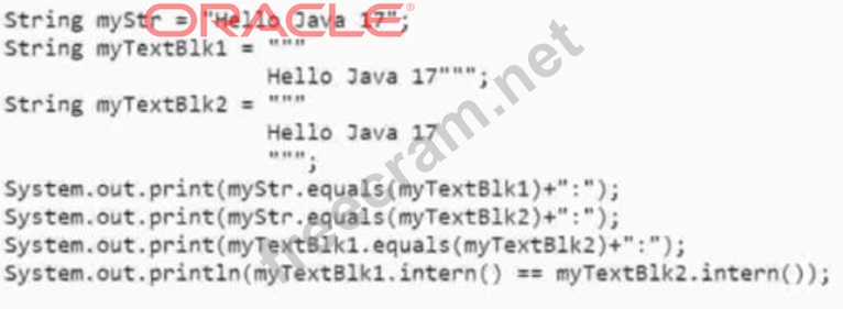 The code fragment compares four pairs of strings using the equals() and intern() methods. The equals() method compares the content of two strings, while the intern() method returns a canonical representation of a string, which means that it returns a reference to an existing string with the same content in the string pool. The string pool is a memory area where strings are stored and reused to save space and improve performance. The results of the comparisons are as follows: s1.equals(s2): This returns true because both s1 and s2 have the same content, "Hello Java 17". s1 == s2: This returns false because s1 and s2 are different objects with different references, even though they have the same content. The == operator compares the references of two objects, not their content. s1.intern() == s2.intern(): This returns true because both s1.intern() and s2.intern() return a reference to the same string object in the string pool, which has the content "Hello Java 17". The intern() method ensures that there is only one copy of each distinct string value in the string pool. "Hello Java 17" == s2: This returns false because "Hello Java 17" is a string literal, which is automatically interned and stored in the string pool, while s2 is a string object created with the new operator, which is not interned by default and stored in the heap. Therefore, they have different references and are not equal using the == operator.
