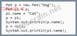 The answer is E because the code fragment creates a new Pet object with the name "Dog" and assigns it to the variable p. Then, it assigns p to p1. Next, it changes the name of p1 to "Cat". Then, it assigns p1 to p. Finally, it sets p to null and prints the name of p and p1. The output will be "Cat" and "null" because p is set to null and p1 still points to the Pet object with the name "Cat".