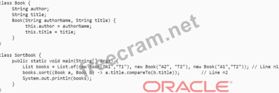 The code fragment is trying to sort a list of books using the Collections.sort() method. The correct answer is D, because the compareTo() method is not the correct way to compare two objects in a Comparator. The compare() method is the correct way to compare two objects in a Comparator and return an int value that indicates their order1. The compareTo() method is used to implement the Comparable interface, which defines the natural order of objects of a class2. The other options are incorrect because they either do not change the type of the list, which is already mutable, or they do not use the correct syntax for sorting a stream, which requires a terminal operation such as collect()3. Reference: Comparator (Java SE 17 & JDK 17), Comparable (Java SE 17 & JDK 17), Stream (Java SE 17 & JDK 17)