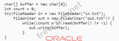 The answer is D because the code fragment reads the content of the in.txt file and writes it to the out.txt file. The content of the in.txt file is "23456789". The code fragment uses a char array buffer of size 8 to read the content of the in.txt file. The while loop reads the content of the in.txt file and writes it to the out.txt file until the end of the file is reached. Therefore, the content of the out.txt file will be "0123456789".
