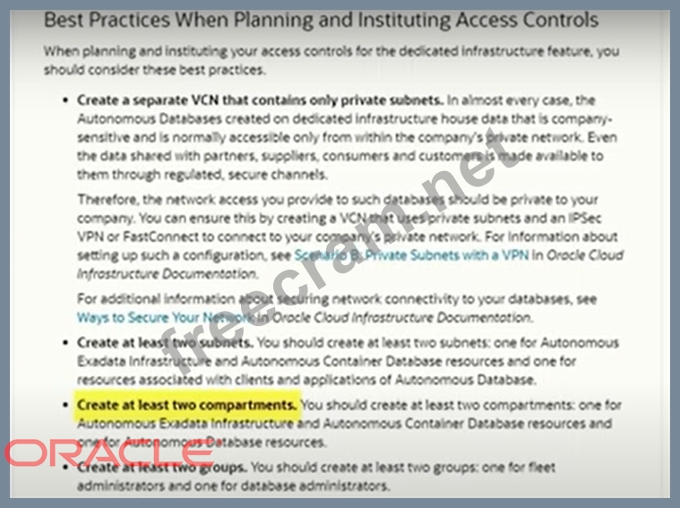 According to Oracle documentation, it is a best practice when planning and instituting Access Controls for your Autonomous Dedicated environment regarding Subnets, Compartments and User Groups.