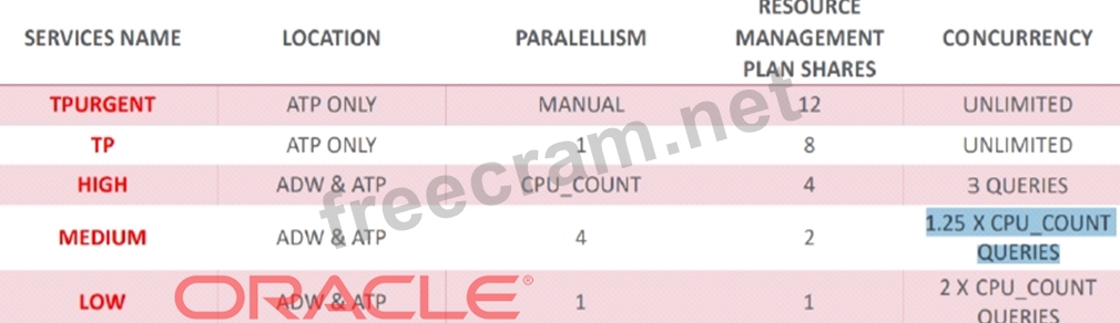 Medium is A typical application connection service for reporting and batch operations. All operations run in parallel and are subject to queuing. Using this service the degree of parallelism is limited to four (4) and concurrency is 1.25 X CPU_COUNT QUERIES