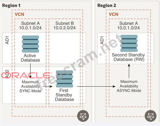 We recommend using the maximum availability mode in SYNC mode between two availability domains (same region), and using the maximum availability mode in ASYNC mode between two regions. This architecture provides you the best RTO and RPO without causing any data loss. We recommend building this architecture in daisy-chain mode: the primary database ships redo logs to the first standby database in another availability domain in SYNC mode, and then the first standby database ships the redo logs to another region in ASYNC mode. This method ensures that your primary database is not doing the double work of shipping redo logs, which can cause performance impact on a production workload.