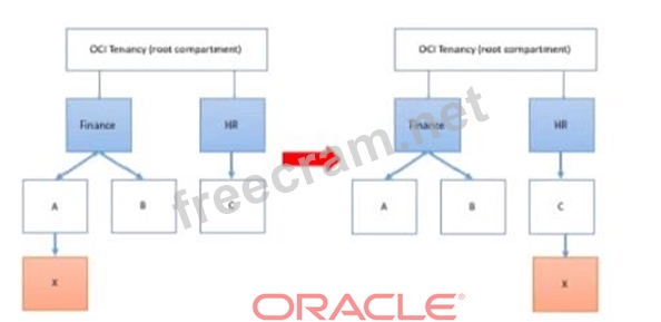 You can move a compartment to a different parent compartment within the same tenancy. When you move a compartment, all its contents (subcom partments and resources) are moved with it. After you move a compartment to a new parent compartment, the access policies of the new parent take effect and the policies of the previous parent no longer apply. Before you move a compartment, ensure that: - You are aware of the policies that govern access to the compartment in its current position. - You are aware of the polices in the new parent compartment that will take effect when you move the compartment. 1- Policy that defined in root compartment: Allow group admins to read subnets in compartment Finance:A:X you move compartment X from Finance:A to HR:C. The policy that governs compartment X is attached to the shared parent, root compartment. When the compartment X is moved, the policy statement is automatically updated by the IAM service to specify the new compartment location. The policy Allow group admins to read subnets in compartment Finance:A:X is updated to Allow group admins to read subnets in compartment HR:C:X so the admins group will have the same access after the compartment X is moved 2- Policy that defined in compartment A: Allow group networkadmins to manage subnets in compartment X you move compartment X from Finance:A to HR:C. However, the policy that governs compartment X here is attached directly to the A compartment. When the compartment is moved, the policy is not automatically updated. The policy that specifies compartment X is no longer valid and must be manually removed. Group networkadmins no longer has access to compartment X in its new location under HR:C. Unless another existing policy grants access to group networkadmins , you must create a new policy to allow networkadmins to continue to manage buckets in compartment X.