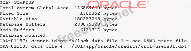You open an RMAN session for the database instance. To repair the failure, you executed the following as the first command in the RMAN session: