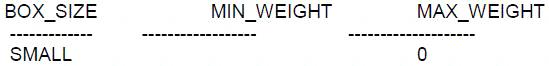 Based on the table structure given in the image, to return the value 'CUBE' from the 'bricks' table when joined with 'boxes', the condition must ensure that the weight of the bricks is within the allowed weight range specified in the 'boxes' table for a 'SMALL' box size. A). True. Since MAX_WEIGHT is 0, a comparison using >= min_weight AND weight < max_weight will only return rows where the weight is less than 0, which is impossible for actual weight values, suggesting there might be a mistake in the data provided or the comparison logic. E). True. NOT (weight > max_weight) effectively translates to 'where weight is less than or equal to max_weight'. However, since MAX_WEIGHT is 0, this condition would only be true if the weight is not greater than 0, which can only happen if the weight is 0 or less. This seems to indicate an anomaly where either the data is incorrect, or the condition is meant to handle a case where the weight is zero or possibly a negative placeholder value. Both B and D will potentially return more than just 'CUBE' if there are bricks with weights greater than MIN_WEIGHT. C is incorrect because BETWEEN is inclusive, and there are no weights that are both greater than or equal to MIN_WEIGHT and less than or equal to MAX_WEIGHT when MAX_WEIGHT is 0.