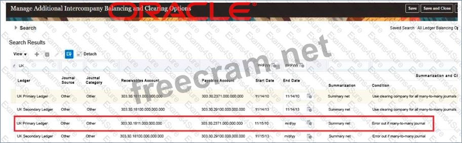 Explanation Intercompany processing will balance a journal using the accounts identified here for the UK Ledger when the journal is balanced by the primary balancing segment value (BSV) but not by second or third BSV. A BSV is a segment in the chart of accounts that identifies a legal entity or business unit for which financial statements are prepared and balanced. A primary BSV is required for every ledger and is used to balance journal entries within a ledger. A secondary or tertiary BSV is optional and is used to balance journal entries across different dimensions otherthan the primary BSV, such as fund or region. Intercompany processing is a feature that enables intercompany transactions between different legal entities or business units within the same enterprise. Intercompany processing uses intercompany balancing rules to generate intercompany receivables and payables accounts for cross-ledger or cross-BSV journals. Intercompany processing will balance a journal using the accounts identified here for the UK Ledger when the journal is balanced by the primary BSV but not by second or third BSV, as this indicates that there is an intercompany transaction between different legal entities or business units within the UK Ledger that requires intercompany balancing. Intercompany processing will not balance a journal using the accounts identified here for the UK Ledger when there is a many-to-many journal and you want to use a clearing company, as this is a scenario that involves multiple legal entities or business units across different ledgers that requires a separate clearing company ledger to perform intercompany balancing. Intercompany processing will not balance a journal using the accounts identified here for the UK Ledger when the journal is not balanced by the primary BSV, as this is an invalid scenario that violates the accounting rules and prevents posting of the journal. Intercompany processing will not balance a journal using the accounts identified here for the UK Ledger when the journal is balanced by second balancing segment value, as this is an incomplete scenario that does not specify whether the journal is also balanced by primary and third BSV. Reference: Oracle Financials Cloud: General Ledger 2022 Implementation Professional Objectives - Configure and Process Intercompany 12