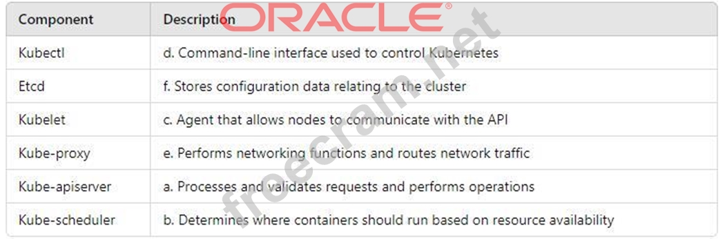 Explanation of Answer E:This option correctly matches the Kubernetes components with their descriptions: * Kubectl- d. Command-line interface used to control Kubernetes * Etcd- f. Stores configuration data relating to the cluster * Kubelet- c. Agent that allows nodes to communicate with the API * Kube-proxy- e. Performs networking functions and routes network traffic * Kube-apiserver- a. Processes and validates requests and performs operations * Kube-scheduler- b. Determines where containers should run based on resource availability