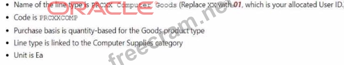 See below in Explanation for each Step. Explanation To create a new Purchasing Line Type, you can follow these steps: Navigate to the Setup and Maintenance work area and search for the Manage Purchasing Line Types task. Click on the Go to Task icon to open the Manage Purchasing Line Types page. Click on the Create icon to create a new line type. Enter the following information in the Create Line Type dialog box: Name: PRC01 Computer Goods Code: PRC01COMP Purchase Basis: Quantity Product Type: Goods Category: Computer Supplies Unit of Measure: Ea Click on the Save and Close button to save the line type. You have successfully created a new Purchasing Line Type. You can verify the line type details by searching for it in the Manage Purchasing Line Types page. For more information on how to define and use line types, you can refer to the Defining Line Types (Oracle Purchasing Help) document. Or use the following: Following the scenario, we need to create a new Purchasing Line Type in Oracle Procurement Cloud named "PRCXX Computer Goods" (replace xx with 01) for purchasing computer supplies. Here are the steps to create the Purchasing Line Type: Navigate to Manage Purchasing Line Types: Go to the Global Navigation Menu. Click on Procurement. Click on Setup and Maintenance. Click on Purchasing Line Types. Create the Purchasing Line Type: Click on the Create icon (+ icon). Enter the Purchasing Line Type Information: Name: Enter "PRCXX Computer Goods" (replace xx with 01). Code: Enter "PRCXXCOMP". Purchase Basis: Select "Quantity-Based". Product Type: Select "Goods". Category: Select "Computer Supplies". Unit: Enter "Ea" (for Each). Description: (Optional) Enter a brief description of the line type. Map Accounts: Click on the Map Accounts tab. Select the appropriate accounts for the following: Inventory Asset Account Inventory Expense Account Cost of Goods Sold Account Click on the Save and Close button. Save the Purchasing Line Type: Click on the Save button. Verification: The Purchasing Line Type "PRCXX Computer Goods" (replace xx with 01) should now be listed in the Manage Purchasing Line Types page. You can verify the details of the line type by clicking on it. The purchase basis, product type, category, unit, and mapped accounts should be displayed as specified above. Additional Notes: Make sure to replace "xx" with your allocated User ID (01) in both the Purchasing Line Type name and code for consistent naming convention. Mapped accounts define where the financial transactions associated with this line type will be posted in the General Ledger. Carefully review the mapped accounts to ensure they are aligned with your organization's accounting practices.
