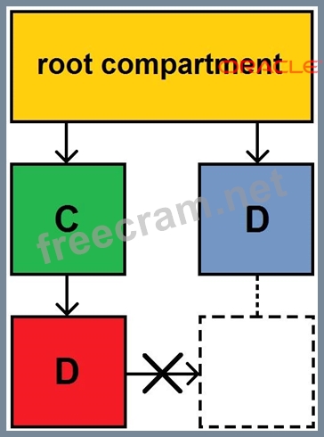 You have compartments C and D under the root compartment in your Oracle Cloud Infrastructure (OCI) tenancy; compartment C contains a sub-compartment also named D. You are trying to move this sub-compartment D to the parent compartment D like shown in the picture, but the move fails.