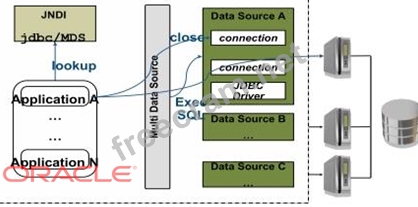 The WebLogic Server JDBC subsystem has supported Oracle RAC since WLS version 8.1 SP5, originally developed for Or.acle9i RAC. This support is based on a particular type of data source configuration, called a multi data source. A multi data source is a data source abstraction over one or more individual data sources. It serves JDBC connections from each of the member data sources according to a specified policy2. A RAC multi data source configuration requires that each member data source obtain connections to a particular RAC instance, as illustrated in the following diagram of a three-node RAC cluster configuration.