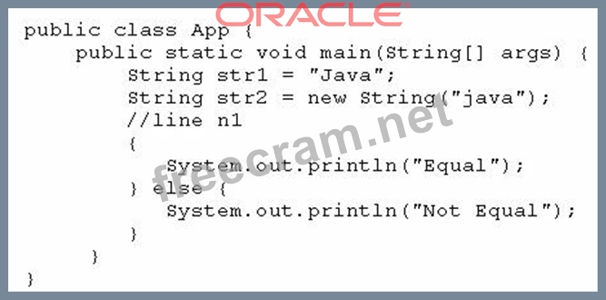 Which code fragment, when inserted at line n1, enables the App class to print Equal?