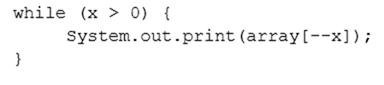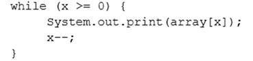 Which two code fragments can be independently inserted at line n1 to enable the code to print the elements of the array in reverse order? (Choose two.) A: