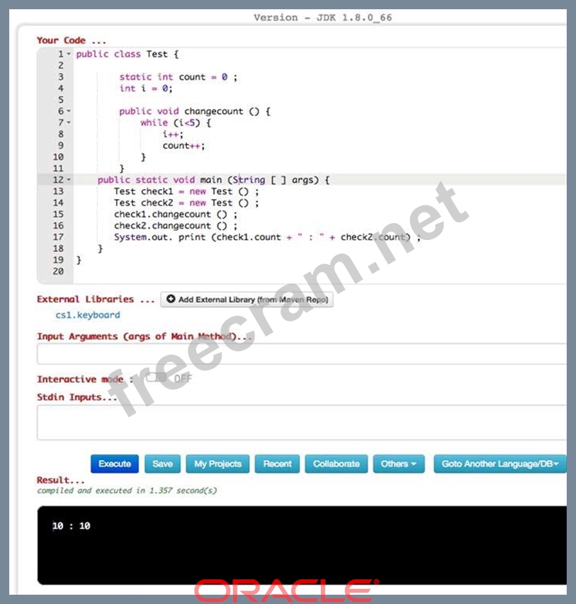 Valid 1z0-808 Dumps shared by ExamDiscuss.com for Helping Passing 1z0-808 Exam! ExamDiscuss.com now offer the newest 1z0-808 exam dumps, the ExamDiscuss.com 1z0-808 exam questions have been updated and answers have been corrected get the newest ExamDiscuss.com 1z0-808 dumps with Test Engine here: