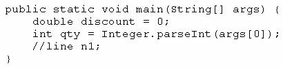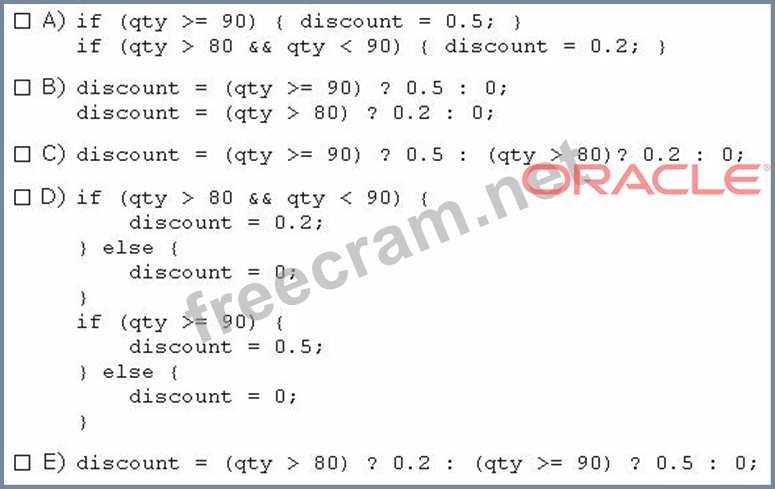 If the value of the qty variable is greater than or equal to 90, discount = 0.5 If the value of the qty variable is between 80 and 90, discount = 0.2 Which two code fragments can be independently placed at line n1 to meet the requirements? (Choose two.)