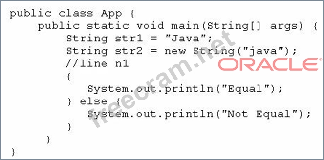 Which code fragment, when inserted at line n1, enables the App class to print Equal?