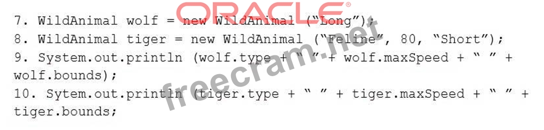 Which two modifications enable the code to print the following output? (Choose two.) Canine 60 Long Feline 80 Short