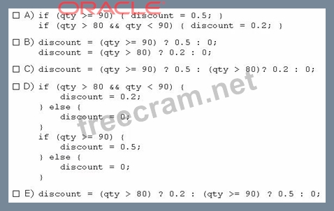 If the value of the qty variable is greater than or equal to 90, discount = 0.5 If the value of the qty variable is between 80 and 90, discount = 0.2 Which two code fragments can be independently placed at line n1 to meet the requirements? (Choose two.)
