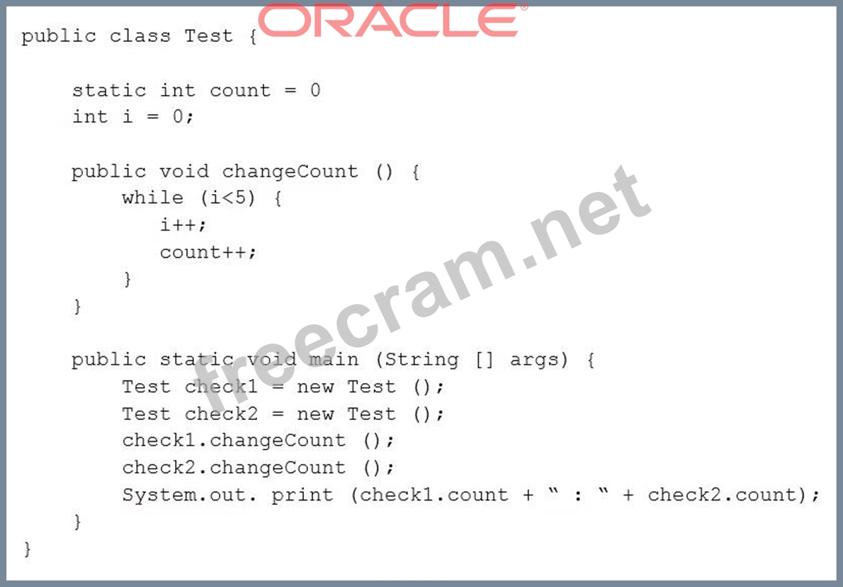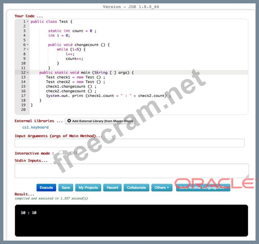 Valid 1z0-808 Dumps shared by ExamDiscuss.com for Helping Passing 1z0-808 Exam! ExamDiscuss.com now offer the newest 1z0-808 exam dumps, the ExamDiscuss.com 1z0-808 exam questions have been updated and answers have been corrected get the newest ExamDiscuss.com 1z0-808 dumps with Test Engine here: