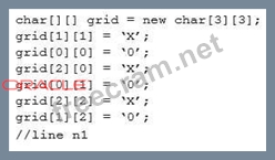 Which line of code, when inserted in place of //line n1, adds an X into the grid so that the grid contains three consecutive Xs?