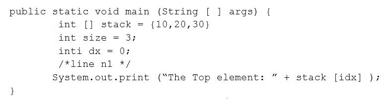 Which code fragment, inserted at line n1, pints The Top element: 30?
