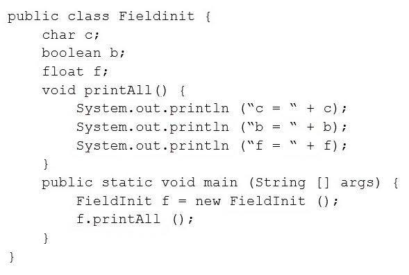 Question 93: Given: public class FieldInit { char c; boolean b; float f; ...