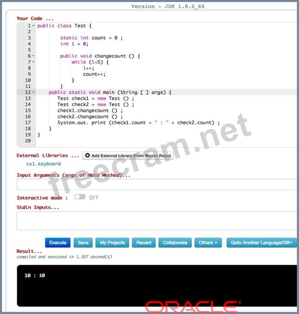 Valid 1z0-808 Dumps shared by ExamDiscuss.com for Helping Passing 1z0-808 Exam! ExamDiscuss.com now offer the newest 1z0-808 exam dumps, the ExamDiscuss.com 1z0-808 exam questions have been updated and answers have been corrected get the newest ExamDiscuss.com 1z0-808 dumps with Test Engine here: